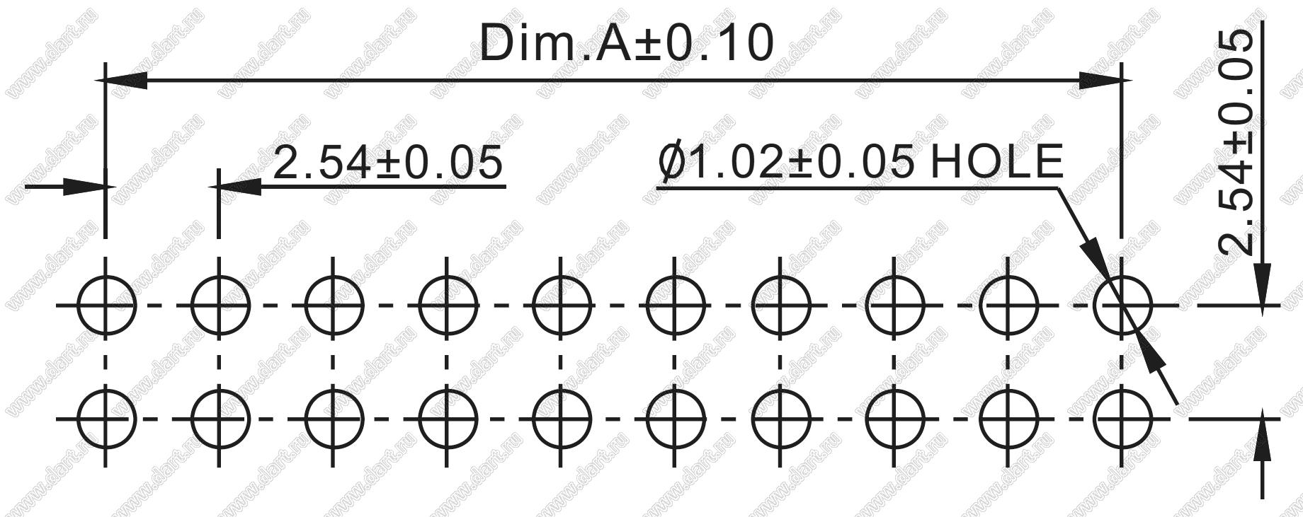 розетки двухрядные прямые (гнездо) на плату для монтажа в отверстия, высота изолятора 7,2 мм; шаг 2,54 x 2,54 мм