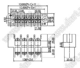Шаг выводов шаг: 13 мм Количество контактов N: 1...15 -конт. Макс. допустимый ток I max: 50/57 А (стандарт UL/ICT) Макс. рабочее напряжение U: 600/750 В (стандарт UL/ICT) Температура рабочая Tраб.: -40...+130 °C Напряжение пробоя (диэлектрическая стойкость) U ≥: 2500 В Сортамент провода A.W.G.: 22-8 Материал винтов: M4, сталь никелировнная Материал контактов: латунь, луженая Материал корпуса: PA66, UL94V-0 Сечение провода: 10 кв.мм Усилие затяжки макс.: 18 кг/см нм |