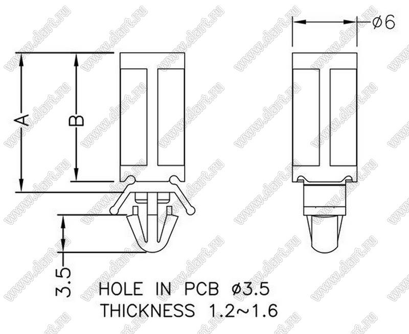 Диаметр отверстия в шасси d отв.: 3,5 мм Толщина шасси t: 1,2...1,6 мм Материал: нейлон-66 (UL) Класс огнестойкости: 94V-2 Цвет: натуральный |