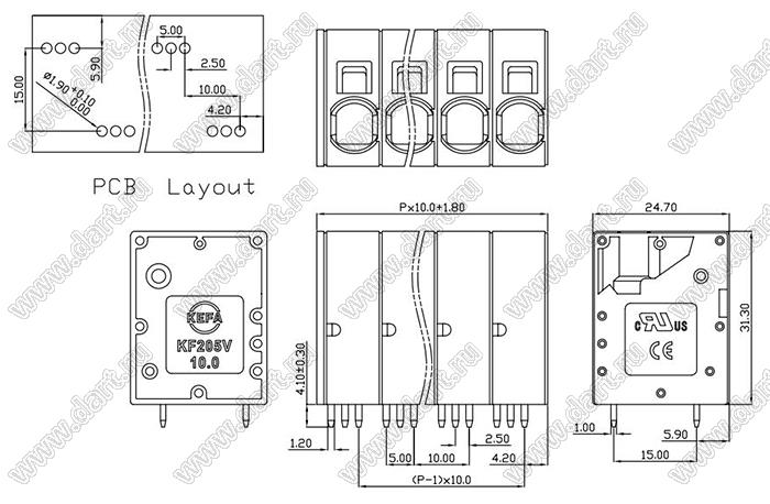 Клеммники нажимные KF205VA-10.0 серии с шагом 10.0 мм, прямые, предназначены для монтажа в отверстия печатних плат. Конструкция соответствует международным стандартам IEC60998, UL1059, UL486E, CSA C22.2 No.158. Условия поставки клеммников нажимных KF205VA-10.0 серии уточняйте у наших менеджеров.