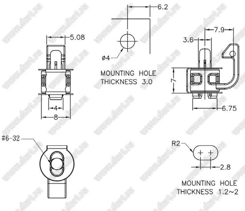 Фиксатор платы с защелкой; dп=4,0мм; s=3,0мм; t=1,2...2,0мм; нейлон-66 (UL); натуральный