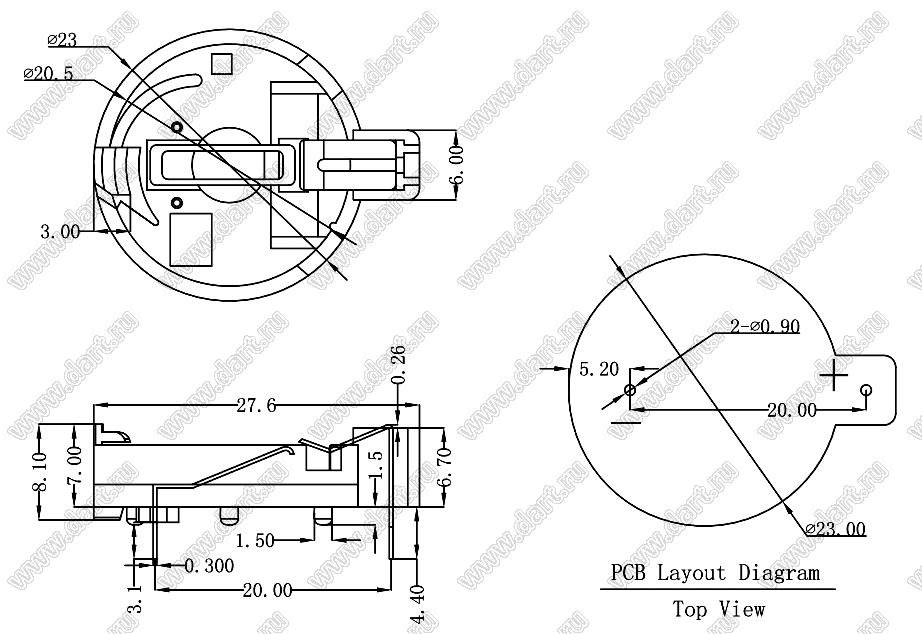 Каталог > Фурнитура для электронных устройств > Держатели аккумуляторов и батареек > Держатели для "таблеточных" элементов питания > Держатели элементов питания типоразмера 2032 > BLCR2325-01 (KLS5-CR2032-02)