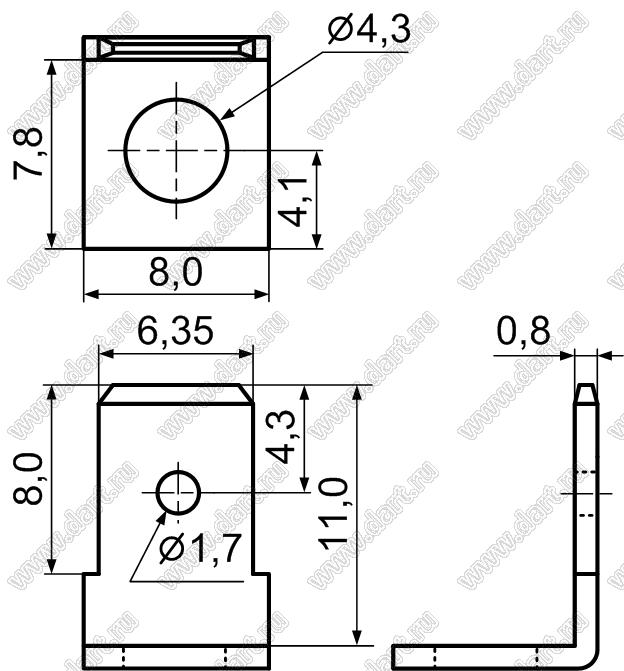 терминал 6,35 мм (0,250”) угловой 90 град. для печатной платы под винтовое крепление М4; латунь луженая; 0,8мм