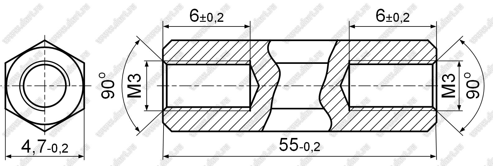 стойка шестигранная; М3x0,5; SW=4,8мм; L=55,0мм; латунь