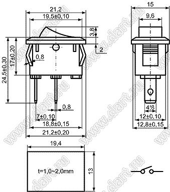 Переключатель клавишный ON-OFF; 21,0х15,0мм; 6A 250VAC/10A 125VAC; толкатель красный/корпус белый; без подсветки; маркировка "O I"; терминалы 4,8x0,8мм