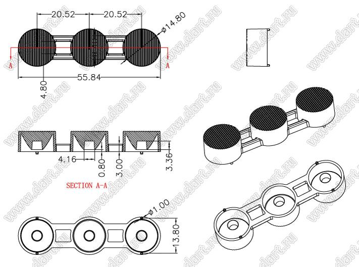 линза для светодиода; 55,8*14,8*13,8мм; 10*65°; PMMA