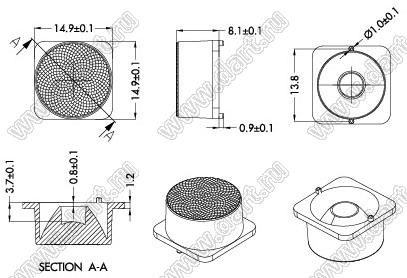 линза для светодиода; 14,9x14,9x8мм; 30°; PC