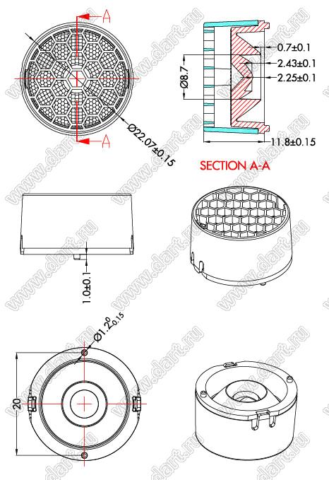 линза для светодиода; D22,07*12,8мм; 15°; PC