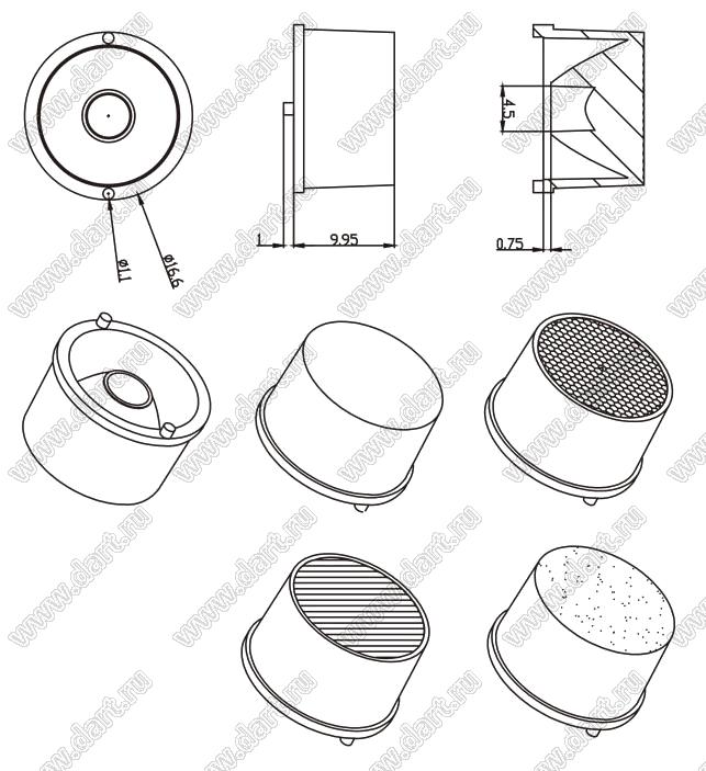 линза для светодиода; D16*10мм; 10°, 15°, 25°, 30°, 45°, 90°, 10*45°, 15*60°, 20*40°; PC