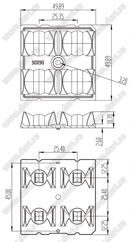 линза для светодиода; 49,89*49,89*10,70мм; 30*90°; PC