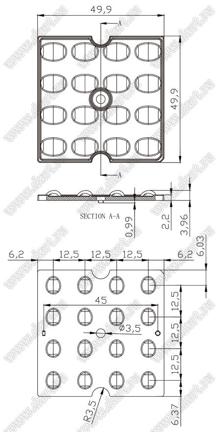 линза для светодиода; 49,9*49,9*4,95мм; 80*151°; PC