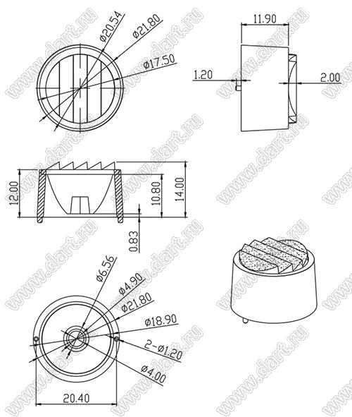 линза для светодиода; D21,8*12,8мм; 8°, 10°, 17°, 23°, 28°, 30°, 43°, 45°, 58°, 60°, 90°, 95°, 12*60°, 15*45°, 20*45°, 25*45°; PC