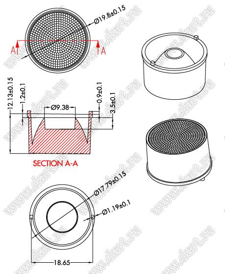 линза для светодиода; D19,8*12,13мм; 60°; PC