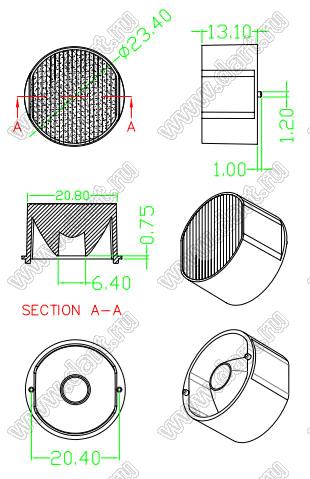 линза для светодиода; D23,4*13,1мм; 20*60°; PC