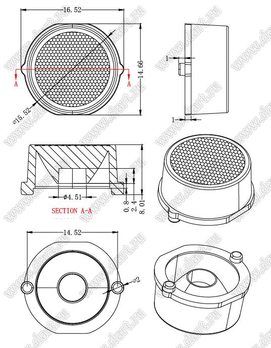 линза для светодиода; В16,52*8,01мм; 45°; PC