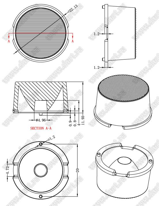 линза для светодиода; D22,13*12,83мм; 20*30°; PMMA