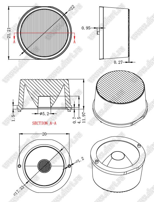линза для светодиода; D22,00*12,67мм; 20*40°; PMMA