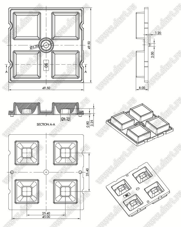 линза для светодиода; 49,5*49,5*8,0мм; 90*90; PMMA