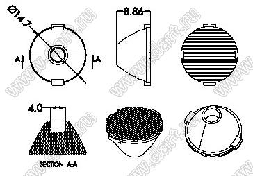 линза для светодиода; D14,7*8,86/10мм; 15*30°; PMMA