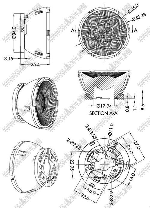 линза для светодиода; D45,0*25,4мм; 36°; PMMA