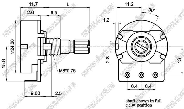 Каталог > Электронные компоненты, радиодетали > Резисторы > Резисторы переменные (потенциометры) > Роторные > 24 мм > R2410N-20KQ-B3K3