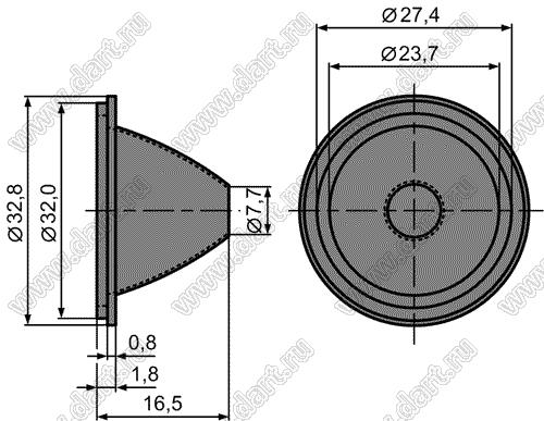 линза для светодиода, D=33мм, d=8мм, H=16мм, 20град; поликарбонат