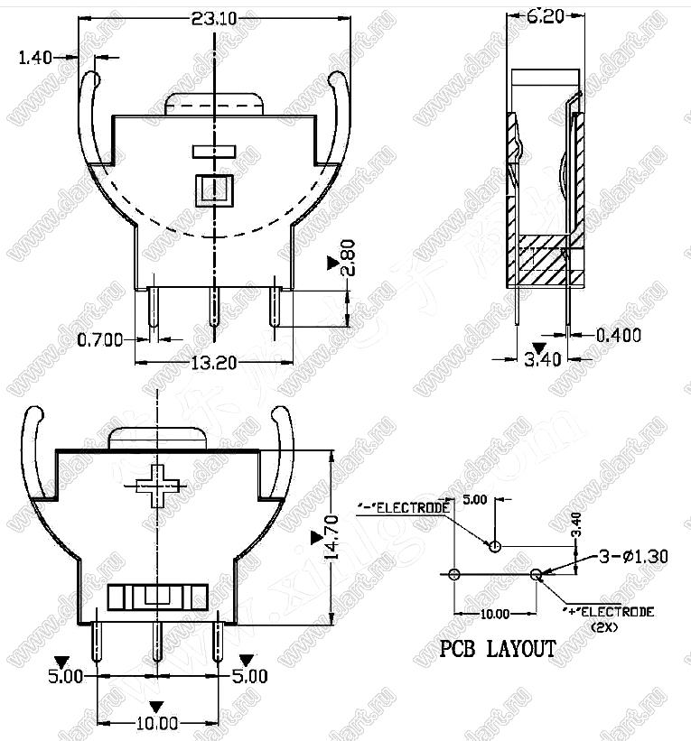 Каталог > Фурнитура для электронных устройств > Держатели аккумуляторов и батареек > Держатели для "таблеточных" элементов питания > Держатели элементов питания типоразмера 2032 > CH74-2032 (BS-5, KLS5-CR2032-04)