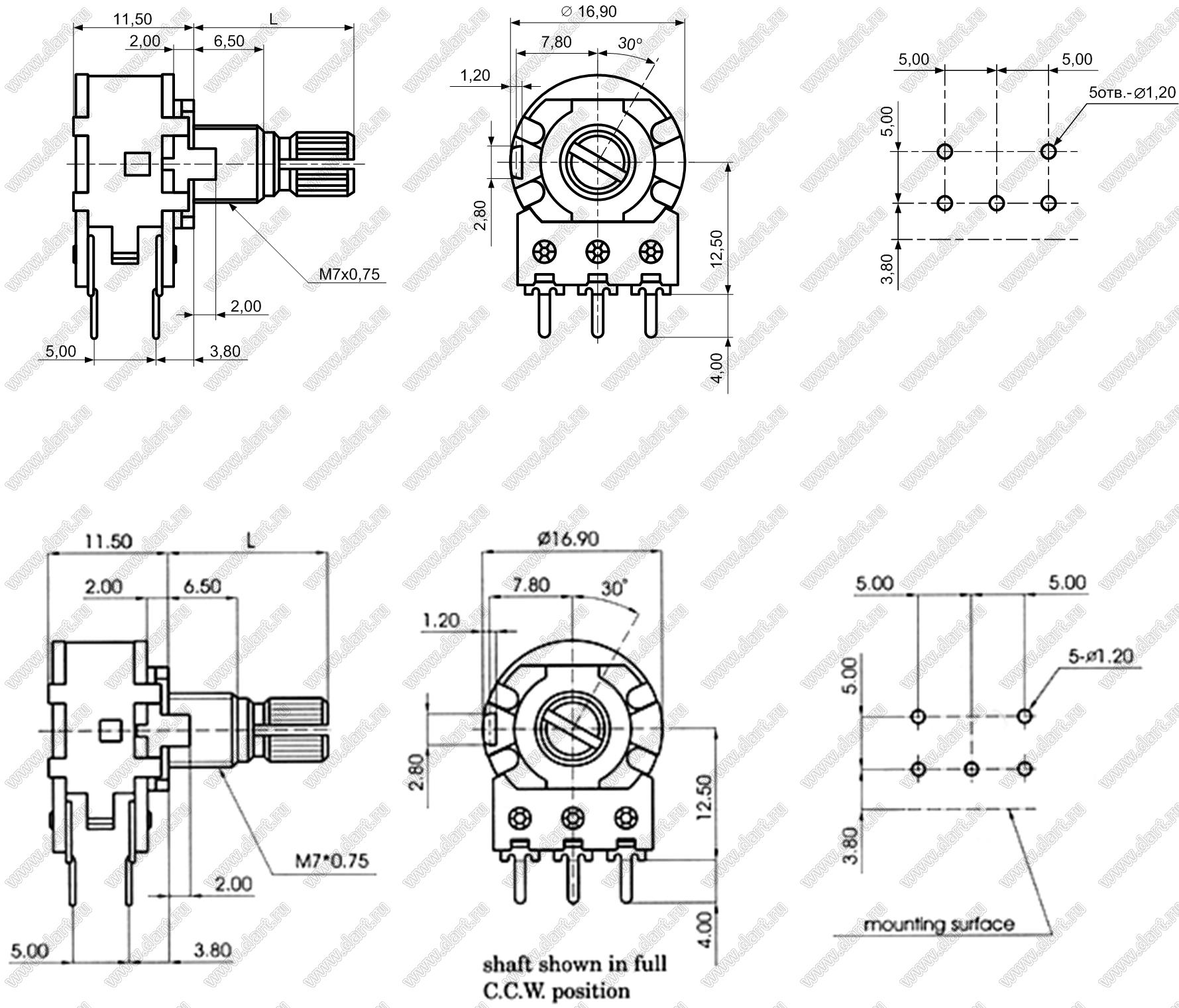 Каталог > Электронные компоненты, радиодетали > Резисторы > Резисторы переменные (потенциометры) > Роторные > 16 мм > R1620S-2A1-B103K